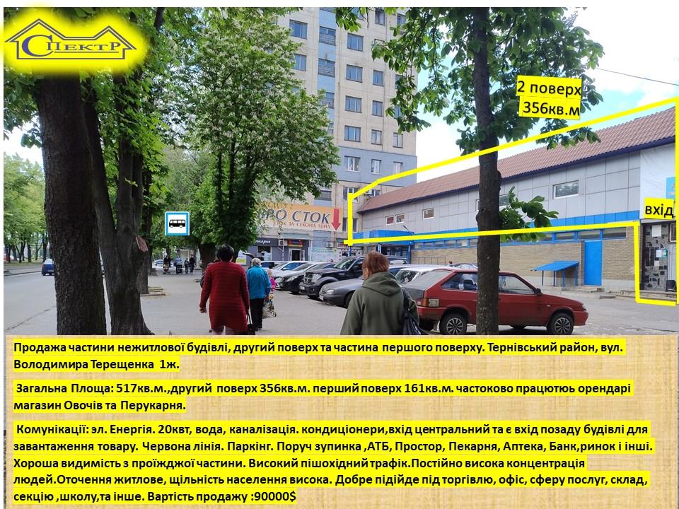 Продаж частини нежитлової будівлі, другий поверх та частина першого поверху. Тернівський район, вул. Володимира Терещенка 1ж.