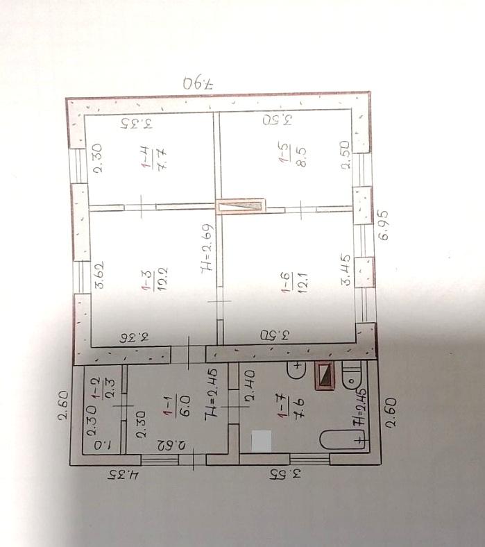 -будинок(1961,1980): заг.пл.56. 4кв.м (фундамент- камень, стіни- шлакоблок обкладений цеглою утеплений 10см пінопласт, дах металочерепиця), житлова- 40.5кв.м.(12.2\ 7.7\8.5\12.1) Н-2.70м, сан вузол сумісний- 7. 6кв.м, коридор-6.0кв.м.